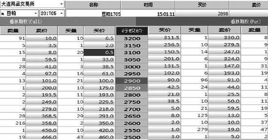 例图是一个比较典型的T字报价表,合约标的为2017年5月份豆粕期货,左侧为看涨期权,右侧为看跌期权,中间显示的价格是期权合约行权价,因为固定不变的栏位名称和行权价构成了英文字母“T”,故称之为“T字报价”。