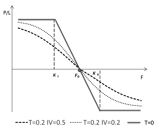 对于期权买方来说,隐含波动率上涨,价格上涨获利增加;对于期权卖方来说,隐含波动率上涨,价格上涨获利减小。垂差策略恰恰在盈亏平衡点两端分别显示出期权买方与卖方的性质,所以在考虑波动率时,如果当前行情在盈亏平衡点靠近买腿一侧,投资者可以把自己当做期权的买方,隐含波动率上涨亏损减少;如果在靠近卖腿的一侧,投资者可以把自己当做期权的卖方,隐含波动率上涨收益减少。