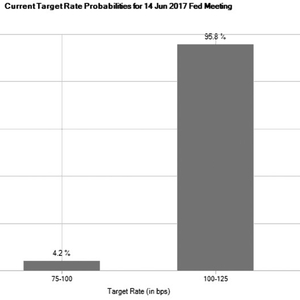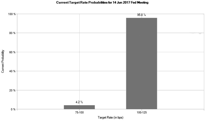 芝商所FedWatch工具30天联邦基金期货(交易代码:ZQ)显示6月加息概率很高,6月6日市场预计美联储在6月14日议息会上加息25个基点的概率达到95.8%。通过30天联邦基金期货测算美联储加息概率,原理是基于联邦基金期货合约价格,假设加息为0.25%(25个基点),联邦基金有效利率(FFER)将作出相同数额的反应。