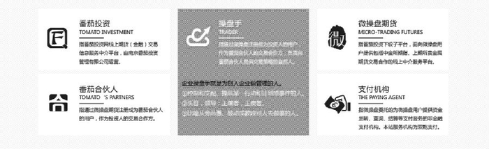 从参与主体来看,番茄微期的参与主体包括了番茄微期平台、操盘手、番茄合伙人及第三方支付机构。操盘手是指通过番茄微期注册成为操盘手的用户,作为番茄合伙人的交易合作方,负责向番茄合伙人提供交易策略的自然人。番茄合伙人则是指通过番茄微期注册成为番茄合伙人的用户,作为操盘手的交易合作方,负责按操盘手的交易策略并利用自有资金和账户进行交易的自然人或法人。而番茄微期则提供包括信息发布、交易撮合、交易指令通讯、交易风控管理、交易结算、资金支付(第三方支付机构)等服务。番茄微期与其他的微盘、微交易、云交易平台基本是一致的。通常此等平台上的用户都无法直接将指令下达到实盘中,需要借助他人的账户来实现。