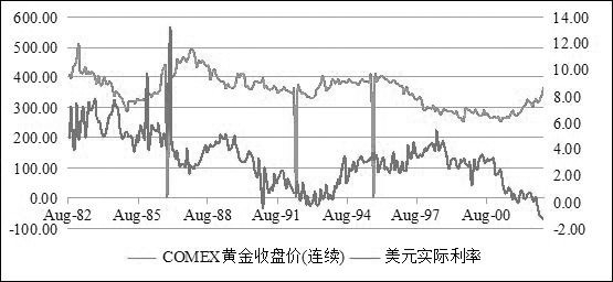图为亚洲金融危机时期COMEX金价和美元实际利率