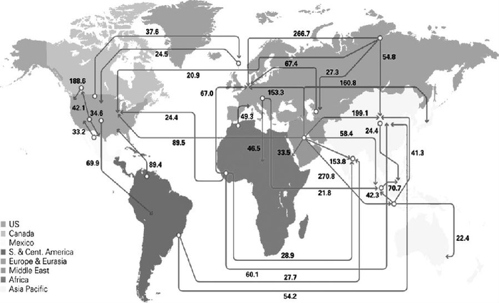 图为2016年全球原油贸易流向(单位:百万吨)