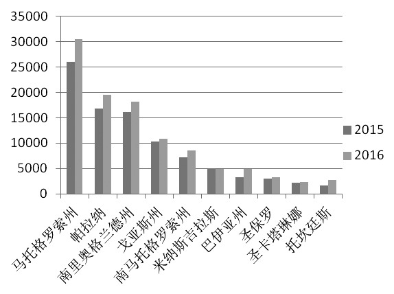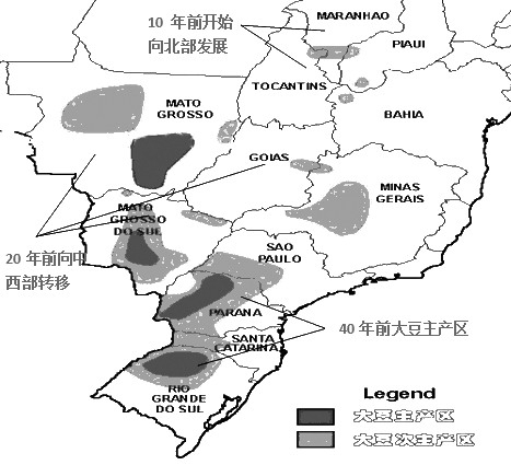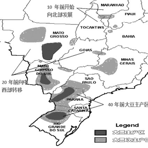巴西大豆产区分布较为集中。40年前,大豆产区主要在帕拉纳州和南里奥格兰德州。20年前,开始向中西部马托格罗索州转移。10年前,大豆产区向北部马拉尼昂州和托坎廷斯州扩张。由于不断开垦,10年来,巴西大豆种植面积以年均5.05%的速度、产量以年均6.40%的速度增长,相比之下,美国年均5%的增速稍显缓慢。目前,帕拉纳、南里奥格兰德和马托格罗索3个州的大豆产量超过全国总产量的60%。