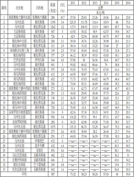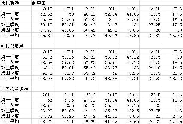 表为巴西港口至中国的海运费(单位:美元/吨)