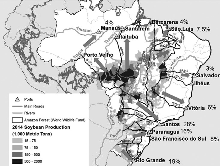 巴西大豆主要经卡车由陆路运至港口。巴西大豆出口量最大的四个港是桑托斯港、里奥格兰德港、帕拉纳瓜港和南圣弗朗西斯科港。以巴西最大的大豆产区马托格罗索州为例,一年产量约为3051万吨,多数都通过卡车向东南运往桑托斯港、帕拉纳瓜港和南圣弗朗西斯港,其余部分通过BR364国道运到波多韦柳,再通过驳船运至玛瑙斯港,或者通过BR163国道运到伊泰图巴港。东部巴伊亚州大豆主要通过BR407国道运往伊列乌斯港,或通过BR242国道运往萨尔瓦多港。中东部米纳斯吉拉斯州大豆主要通过BR262运往维多利亚港,或通过BR374国道运往桑托斯港。南部南里奥格兰德州大豆主要通过BR392国道运往里奥格兰德港。大豆运输主要依靠卡车完成,铁路和河运运力严重不足。