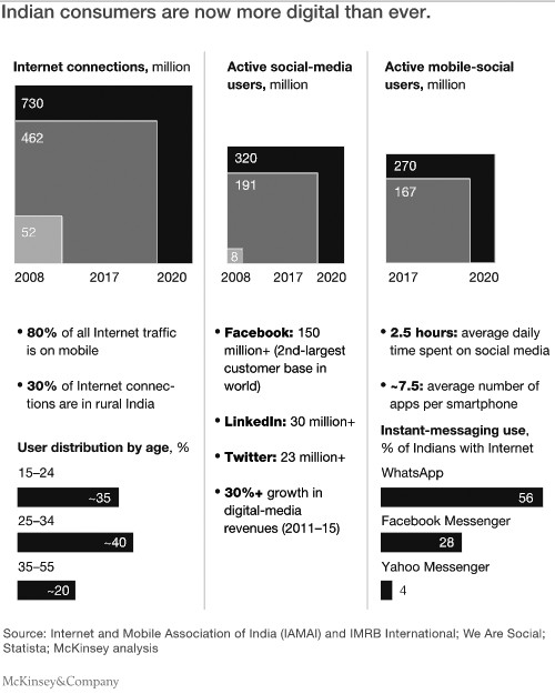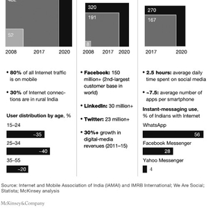 上述这些新型的客户,代表着银行市场的开放。对比过去的客户,他们更有可能被一个或另一个新兴的价值主张所吸引。他们中的大多数都是快速技术的使用者,他们使用互联网和移动电话的频率和时间都在不断增长。互联网接入成本的下降促进了数字技术的普及,截至2016年12月,印度的移动电话通讯比率已降至2013年水平的50%,而互联网、移动互联网的用户数量和数字化需求则呈现爆炸式增长。