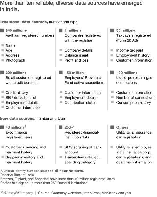 可靠的、多样化的数据来源正在印度出现,这些数据可以被用于金融服务领域,以促进决策明智化、快速化。除了金融交易记录和信用这样的传统数据源,银行现在还可以从电子商务购物、公用事业支付和社交媒体等新来源中获取个人的海量信息。