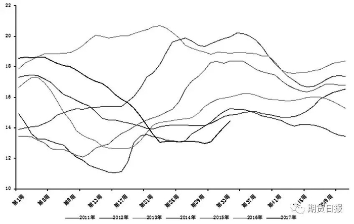 生猪期货上市日期尚未确定。纵观历年生猪行情变化,可对合约上市初期走势有所准备。每年猪价大致从第37周即9月中上旬进入该年度价格“分水岭”。国庆节、中秋节到来之前,猪价是第三季度(往往也是全年)的价格高点。结合生猪期货交割品种,即目前规模养殖场普遍饲养的“外三元”商品猪现货市场价,预期今年猪价或在9月15日前后见顶,价格或在15元/公斤附近。之后逐渐回落,价格在14.5元/公斤左右振荡。第四季度猪价不及三季度,猪价或将保持在14—14.5元/公斤区间。