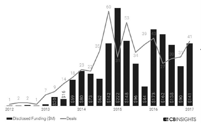 随着应用领域的不断扩大,比特币开始进入投资领域。美国著名风险投资数据公司CBInsight对2012年至2017年区块链全球投融资增长数据的统计显示,2013年起,投资人/机构在比特币及区块链领域的动作明显增多,2013年累计投资超过9500万美元,而2016年该数据为5.6亿美元,增长达4.8倍。