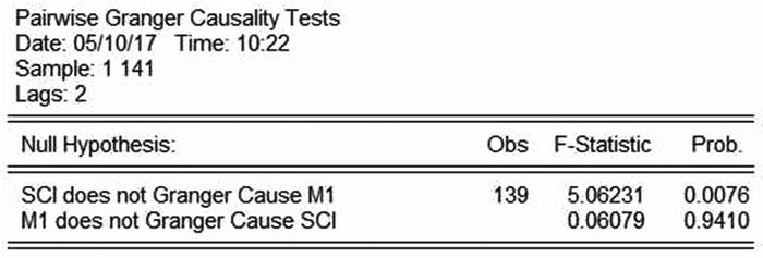 但是,房价和M1互为格兰杰因果关系(说明房价和货币不能完全脱离关系)。对M2与CPI的格兰杰因果关系检验得出: