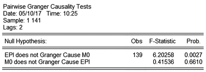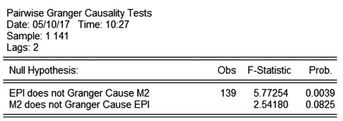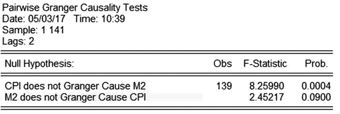 CPI是M2的格兰杰原因,而M2不是CPI的格兰杰原因。最后,股价是M1的格兰杰原因,M1不是股价的格兰杰原因,等等。