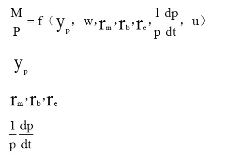 式中M代表名义货币量,P代表物价水平,YP 代表恒久性收入;W代表非人力财富占总财富的比率; <Z:\KT2017\171009c01.tif>分别代表存款、债券和股票的预期收益率;<Z:\KT2017\171009c01.tif>代表物价水平的预期变动率,u代表随机因素的影响总和。