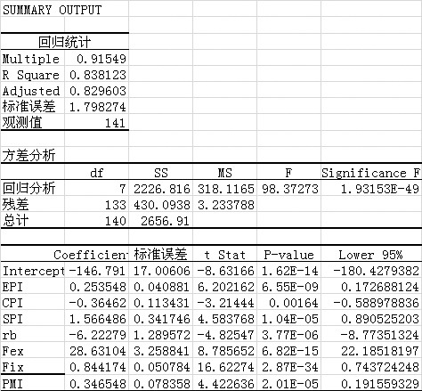 得到自己的回归模型:M2=-146.791+0.253548EPI-0.36462 CPI+1.566486SPI-6.22279rb+28.63104Fex+0.844174Fix+0.346548PMI