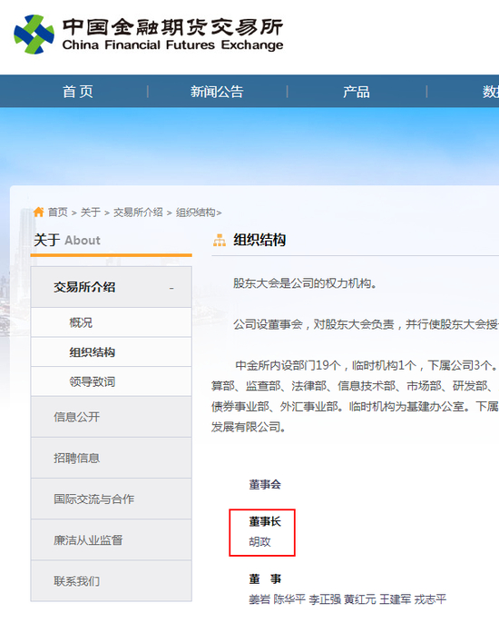 新浪期货讯 据悉,近期中金金融期货交易所内部宣布,中金所总经理胡政已经升任中金所董事长。11月8日,新浪期货通过访问中金所官方网站,查询对外公布的组织结构来看,胡政就职董事长无疑。(原中金所董事长张慎峰已于2017年8月30日升迁中国证券监督管理委员会主席助理。)