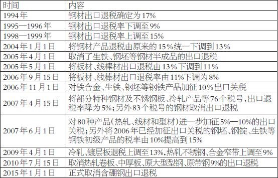 1994年税制改革以来,我国钢材出口政策经历了十多次大的调整,下表为历次调整情况。