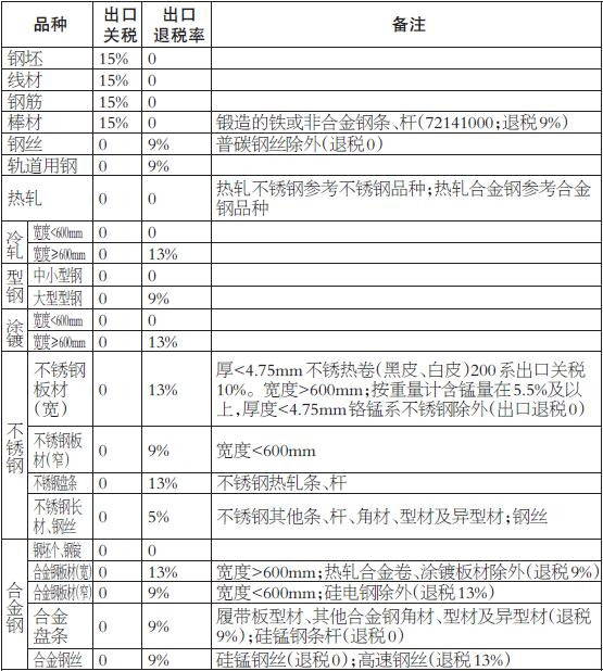 表为我国主要钢材品种现行关税和出口退税率一览