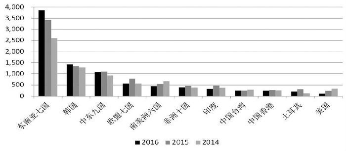 图为2014—2016年我国钢材主要出口国家和地区(单位:万吨)