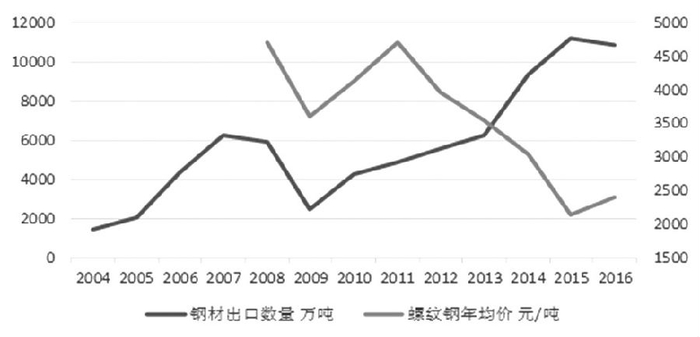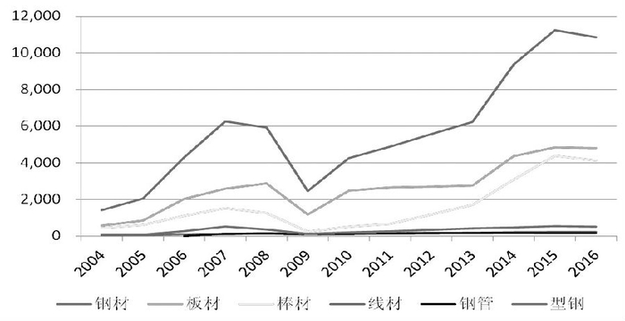我国是世界主要产钢国,2016年钢材产量11.38亿吨,占全球总产量的70%。2004—2016年,我国钢材出口整体处于上升状态,不过2008年受金融危机冲击,2009年钢材出口量陡然下降,直到2013年才回复到危机前水平。