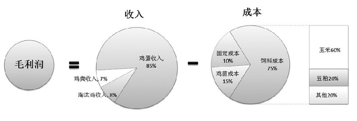 成本方面,鸡蛋的生产成本构成较为稳定。其中鸡苗约占15%—20%,成本与淘汰鸡收益基本相抵;饲料成本约占70%,固定成本约占10%,参照家庭农场模式,可将养殖场固定成本及其他疾病控制、燃料费、水电费、人工费用等成本一同摊入饲料成本。
