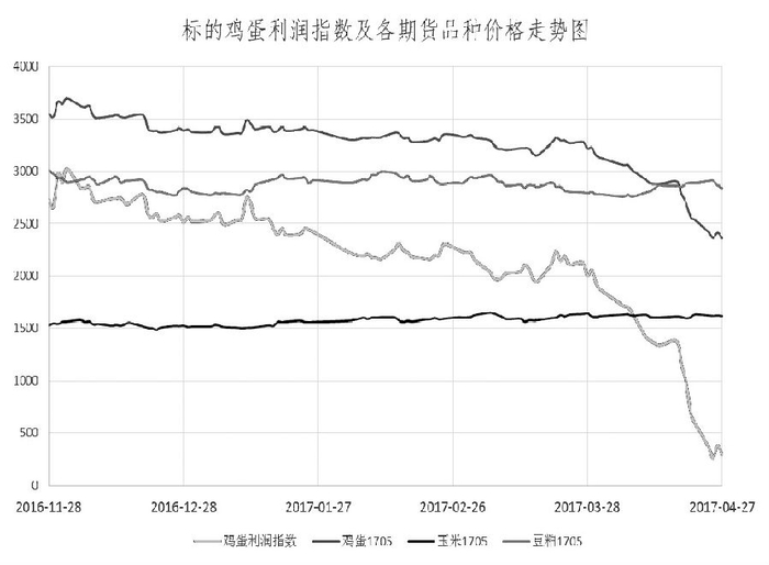 鸡蛋利润套保指数(每吨)=销售价格-进货成本=每吨鸡蛋价格-(1.725吨玉米+0.575吨豆粕价格)