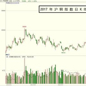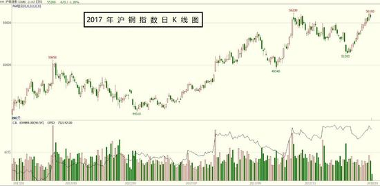 下图是2017年沪铜指数期货价格日K线具体走势: