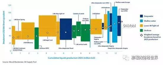 那么这个临界点或动态平衡点在哪里呢? 我们尝试用下图的页岩油生产成本曲线来描述(传统油气资源的价格相对低很多,如中东很多国家的开采成本在20美元左右)