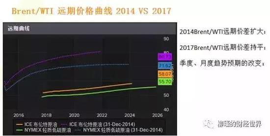 最后,我们对比2014年和现在的原油远期结构会发现,站在2014年时点来看,Brent和WTI的价差预期在扩大,也就是说,在2014年市场认为页岩油的增量是越来越大的(我们把页岩油的变量近似的纳入到WTI的价格当中),而到了2017年的时点,两者几乎是收敛平行的,虽然这一定程度受到了美国原油出口解禁的影响,但也意味着市场预期当前页岩油气已经越来越接近生产的瓶颈,难以产生突破性的变化,于是主导价格的变量因子应当转移到OPEC产量上了,也就是后来市场博弈的OPEC减产协议上了。(本文数据取自2017.7)。