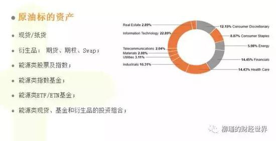 原油的标的资产包括现货、纸货,以及原油的衍生品(上图),其中包括期货和期权。CME交易中期权占有很大一部分,右图可以看出美股的6%左右是能源股票,不仅包括原油,还包括天然气和其他的资产。