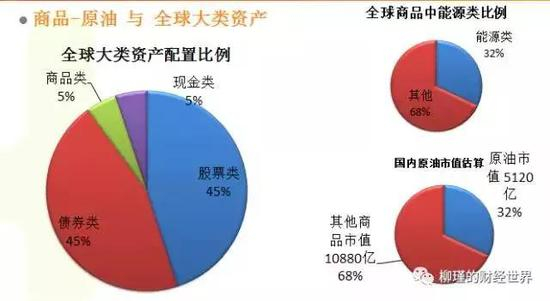 那么在全球大类资产配置中原油是处在什么样的地位?在全球100多万亿美元的大类资产市场中,大宗商品大概占比5%,债券和股票各占45%。