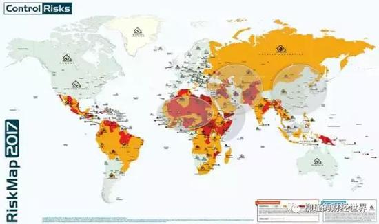 下图为国外智库所做的2017年全球地缘政治风险分布地图。依据颜色的不同,可以看到地缘政治风险分布的程度,红色区域级别最高,黄色区域中等,浅色区域最低。图中划有三个圆圈,其中一个圆圈是中国,相对来说颜色较淡,另外两个圆圈是西非和中东,是中国原油进口来源的主要地区,这两个区域都是地缘政治风险最高的区域,中国原油输入的主要运输通道也都处在地缘政治风险最高的地区。