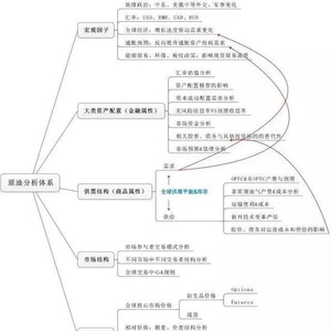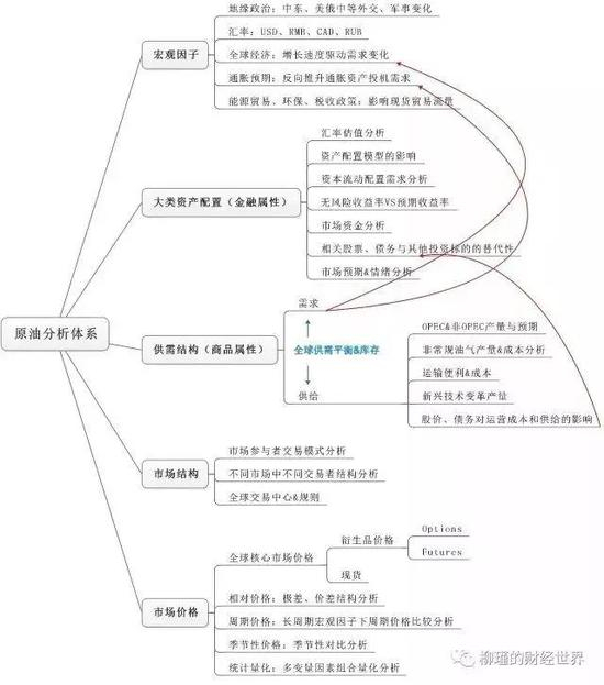 上图是原油的分析框架体系,包括:宏观因子(政治属性)、大类资产配置(金融属性)、供给-需求(商品属性)、市场结构、价格分析五个部分,后面分别展开描述。