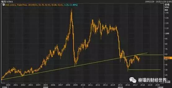 上图是布伦特月K线,我们观察到三次系统危机连线形成的长期趋势线在关键时点被打破:从1998年俄罗斯国债违约、到2001年911危机,再到2008年金融危机三点连成的趋势线,在2015年7月伊核谈判通过后被完全改变,整个原油供给的结构随伊朗400万桶/天产能被释放而彻底改变,进而造成Brent价格进一步的下跌、并几乎再也未能趋势性的突破65美元左右的高点。