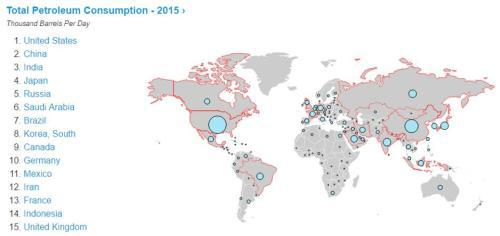 美国一直以来都是一个能源消费大国,大家可以看到北美的这个大圈圈就代表了美国一年的原油消费量。