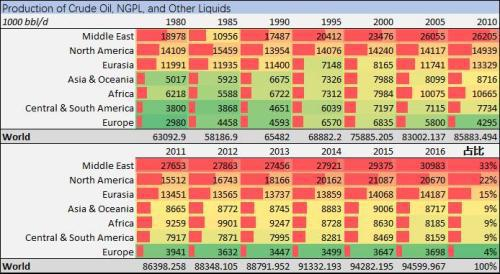 但是按照区域划分,中东的原油产量一直是位于世界第一。2016年中东产油占全球产量的33%,北美地区占比全球产量的22%,两个主要石油出口地区的产量占全球产量的55%。