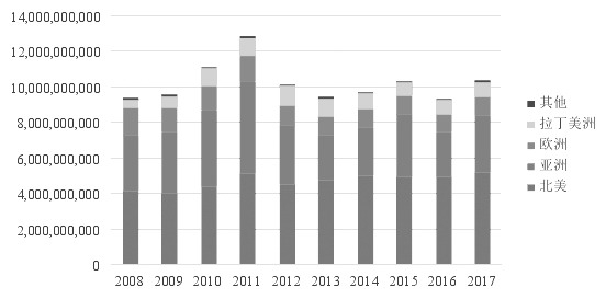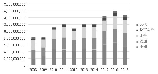 回顾过去的10年,亚太地区成交量在一开始的几年里增长速度较快,且在2010年首次超过北美,2011年达到顶峰水平,但之后便开始波动,最近两年均呈下降趋势。