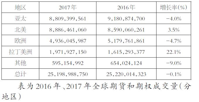 根据美国期货业协会(FIA)的最新统计,2017年全球期货及期权总成交量与2016年基本持平。事实上,过去3年全球期货及期权总成交量一直保持在同一水平——约250亿手。然而,2017年这一数字却隐藏着一些重大变化:期货成交量持续5年增长后呈下降趋势,而期权成交量有所上升。从地域分布看,北美地区成交量有所增长,亚太地区成交量有所下滑。从衍生品类别看,利率衍生品成交量激增,而商品期货、期权似乎褪去了2016年“牛市”的耀眼光环。2017年,并不是只有一个“主题”的一年,在这一年的时间里,某些长期的趋势已经结束,新的趋势开始出现,一些看似平静的市场开始恢复生机,而一些活跃的市场出现了降温的迹象。