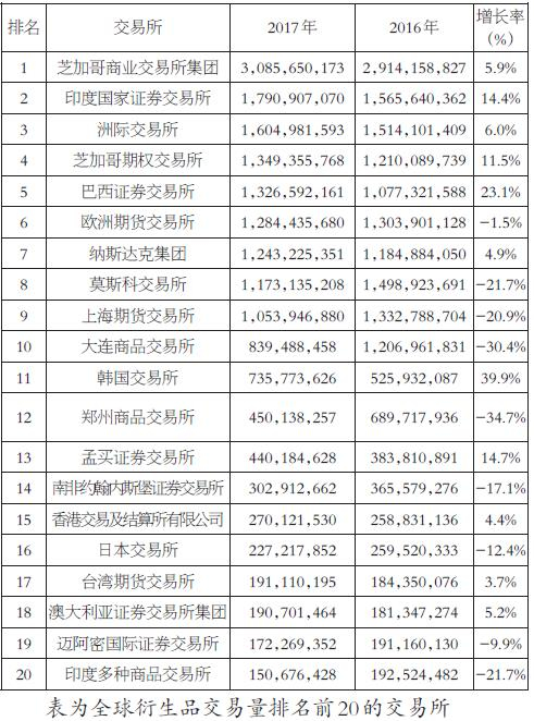 亚太地区成交量下降,主要原因是中国三家商品期货交易所总成交量下降,从2016年的41.2亿手降至2017年30.5亿手,下降了25.9%。例如,相比2016年,上海期货交易所的螺纹钢期货成交量下降了24.8%,大连商品交易所的豆粕期货成交量下降了58.1%,而郑州商品交易所的菜粕期货成交量下降了67.6%。事实上,2017年新推出的商品期货成交量增长相当迅速,但这并不足以抵消上述合约成交量的大幅下降。