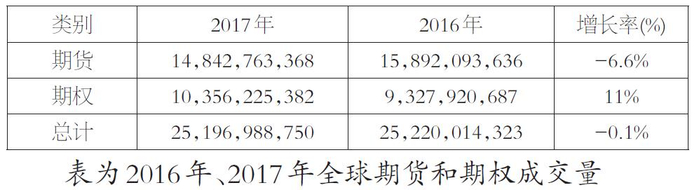 据FIA的最新数据,2017年,全球场内期货及期权成交量达251.9亿手,较2016年的252.2亿手下跌0.1%,其中期货成交量在持续5年增长后呈下降趋势。2017年,期货成交量为148.4亿手,比2016年下降6.6%;相反,期权成交量为103.5亿手,比2016年上升11%。