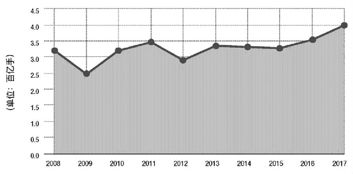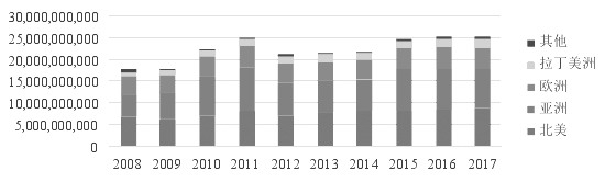 分地域来看,2017年,北美地区成交量上升了3.5%,达88.9亿手;拉丁美洲地区成交量增长了22.1%,达19.7亿手。北美地区和拉丁美洲的成交量再创新高。相比之下,亚太地区成交量连续第二年下降,至88.1亿手,其占比总份额也从36%降至34%,排名第二略低于北美地区;欧洲地区成交量下降了4.7%,至49.4亿手。