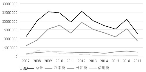 就类别而言,2017年,金融期货和期权成交量有所上升,商品期货和期权交易量有所下降。其中,利率衍生品增幅最大,成交量达397亿手;农产品类跌幅最大,下跌至131亿手,比2016年下降了32.4%。
