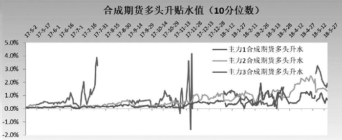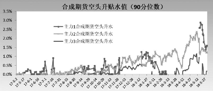 在正向套利中,在做多标的豆粕期货的同时做空豆粕期权合成期货,我们需观察合成期货空头的升贴水结构。合成期货空头升水越高,正向套利利润越大。下图为豆粕三个主力平值合约的合成期货空头升贴水情况,我们使用 90 分位数(可揭示套利最大利润水平且不易受极值影响,同理,在观察合成期货多头升贴水时使用 10 分位数)进行观察。由图中可以明显看出,今年4月底以来主力 2(m1809)出现了明显升水幅度,达 2%(已年化)以上,且升水幅度不断扩大。5 月 16 日起 m1809 转为主力 1,其在 5 月 18 日达到了上市以来升水最高值 2.91%,随后明显回落。