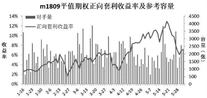 近期豆粕期权正向套利10%以上的收益率,应可覆盖大部分资金成本并带来一定利润,是较好的交易机会。对于大资金来说,自然要考虑策略容量问题。下图为豆粕 1809 平值期权的正向套利收益率及其盘口买卖量。此仅为回测数据,若实盘参与交易,盘口将随时发生变化,故仅供参考。从图中看出,在近期较高收益率水平下可有2000张左右的交易量,若保守估计按1000 张成交量计算,豆粕期货3000点,策略容量在600万元左右,并可持有至到期。若策略收益率持续保持高位,投资者亦可持续建仓至最高1万张的持仓限额。