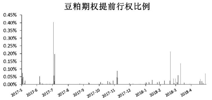 笔者统计了豆粕期权提前行权比例情况(行权量/持仓量),从图中可以看出,除个别交易日行权量较多外,大部分时间段少有或没有豆粕期权参与提前行权。2017年5月到2018年5月交易期间,仅有1.55%的交易日有提前行权记录,且提前行权比例均值仅为0.02%。也就是说,投资者若参与平价套利,每日被提前行权的概率仅有1.55%;即便被提前行权,参与行权数量也非常少,仅为持仓的0.02%。