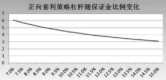 从公式中可以看出,对于平值期权,一组正向套利的资金占用值为 2 倍期货保证金+看跌期权权利金。杠杆值=标的期货/资金占用,使用平值期权进行正向套利的杠杆为1/(P/F + 2b)。我们以持有期为 60 天、豆粕期货价格 3000吨/吨的平值期权为例,下图体现了杠杆随保证金变化情况: