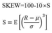 如上述公式所示,S的定义类似统计学中的偏度指标,代表标的价格的偏度情况;R是标的的30天对数收益,μ为其均值,σ为其标准差。之所以会有这样的计算方式是因为传统计算方法计算出来的偏度数值S的波动区间相对较小,在实际应用中并不方便,故对其进行放大处理后,形成了国际上常用SKEW指数。
