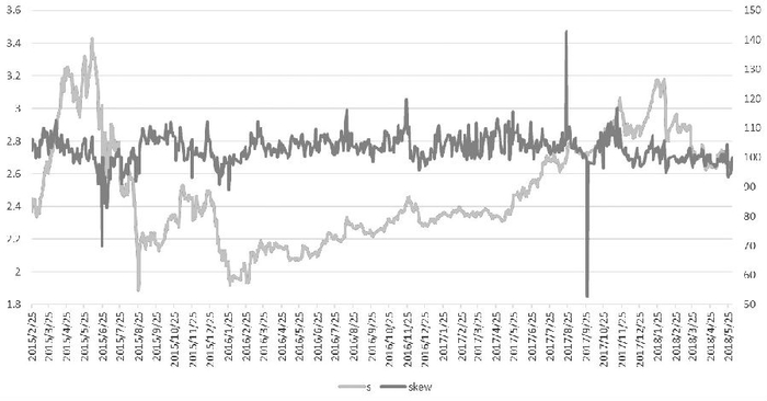 如图所示,50ETF期权SKEW指数与国外SP500的SKEW指数有一定差异。我们可以看出50ETF期权SKEW指数和50ETF期权近月合约剩余日数之间没有显著的线性关系。换而言之,随着时间的流逝,50ETF期权SKEW指数没有一个固定变化模式,故该指数无显著的收敛性或者发散性可以进行简单的统计套利。
