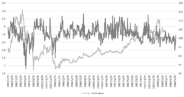 根据前文介绍的芝加哥偏斜指数计算公式,我们尝试把它运用至国内的上证50ETF期权之中,探索标的行情与SKEW指数走势的关系以及SKEW指数的特征。