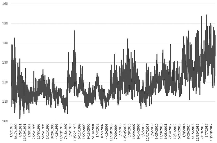 最终计算所得的50ETF SKEW指数如下图所示,可见50ETF期权SKEW指数和国外SP500 SKEW指数有一定差异。最显著的一点是,SP500的SKEW指数分布区间在101—147,绝大部分时间处于110—120区间。由于国外的SKEW指数基本在100以上,这意味着场内期权交易者对SP500的对数收益分布的公允估计是左偏的。
