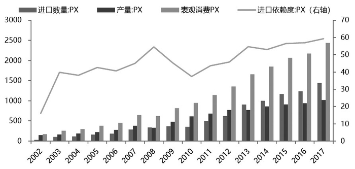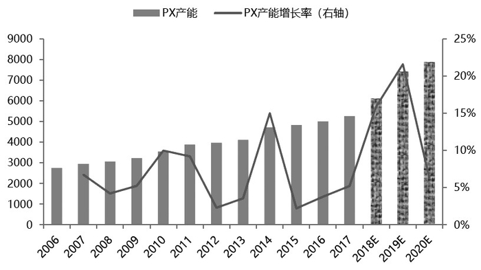 从2002—2010年,中国PX产能发展较为迅速,平均增速在20%附近,生产能力成为全球第一;2009年,由于福佳大化、中海油惠州以及上海石化二期集中投产,PX产能增速达到63%的高位;但在2011年、2016年和2017年中国都没有新增PX产能。近几年,中国PTA产能持续走高,而PX建设却步伐放缓,产能开始无法满足需求。