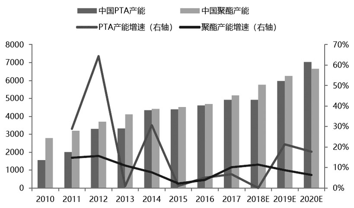 图为中国PTA产能和聚酯产能增长情况(单位:万吨;%)